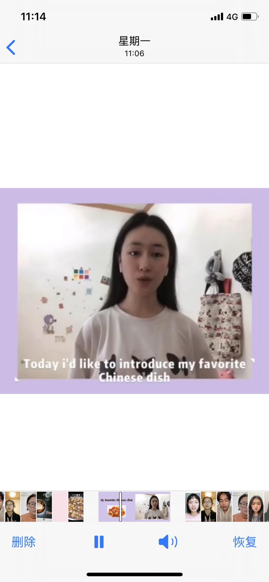 网课进行到12周,学习到中餐这一节,我布置学生录视频,介绍自己最喜欢吃的一道中餐,要求说明推荐理由。要完成这个任务,学生必须大量查阅资料,搜集餐饮相关的英文术语,比如菜名的翻译方法,原材料、调味品、烹饪方法的术语,菜品特色的介绍方法等等。很多学生还运用现代多媒体技术,在视频中加入图片、音乐、字幕等元素,最后呈现出来的视频作业氛围轻松,情景灵活,内容丰富,影音生动形象,达到了预期的效果。