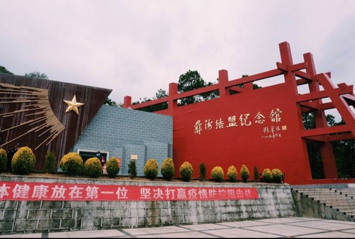 彝海结盟景区位于四川省凉山彝族自治州冕宁县,是国家AAAA级旅游景区。从彝海沿着步道往上走,小广场正对着彝海结盟纪念碑。爬上楼梯,纪念碑旁边的草坪,就是当时刘伯承元帅与彝族果基家支首领果基约达(小叶丹)举行结盟仪式的地方;草坪上有3块石头,石头仍保留着原来的样子,80年历经风雨仍固守于此,正好印证了“彼此愿永结弟兄,肝胆相照,团结如一,永不反悔”的誓言。导游讲解完毕后,同学们自由参观浏览。