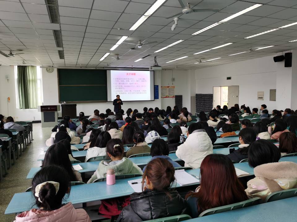 2020年12月10日,下午2点10分在行知楼301教室,讲座如约开始。孙教授首先为同学们讲解了楹联的定义,然后深入浅出地区分了楹联和传统对联的区别及和诗词的联系。然后同学们积极参与讲座互动,体现了传统文化的魅力,依然蓬勃着生机,吸引着一代又一代的人。尤其是同学们亲自赏读多字联:“海水朝朝朝朝朝朝朝落,浮云长长长长长长长消”,真正的感受到了楹联文化的魅力。文化的薪火,将代代相承。