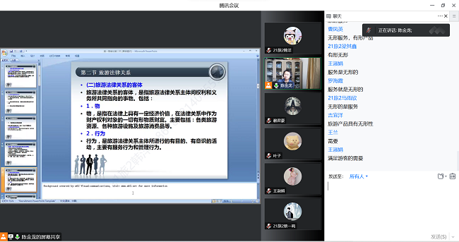 本网讯(图、文/刘丹)为提升学生在线学习的效率,让学生学有所获,学有所得,万象城allwincity官方网站入口陈金龙老师在《旅游法规》课程教学中采用了双平台、“教”“练”融合的授课方式。