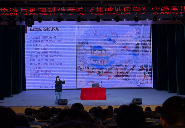 本网讯(图、文/向婉丽)为激发新生专业兴趣、拓宽跨学科创新视野,2025年11月25日下午,由基础地质学授课教师乔恒忠、向婉丽共同策划组织的一场别开生面的兴趣导向讲座在多功能厅成功举办。本次活动特邀成都理工大学王夏副研究员与我校优秀校友、四川省诗书画院专职画家罗婧文老师联袂开讲(见图1),为地理科学、人文地理与城乡规划专业的大一新生带来一场融合理性与感性的思维盛宴。