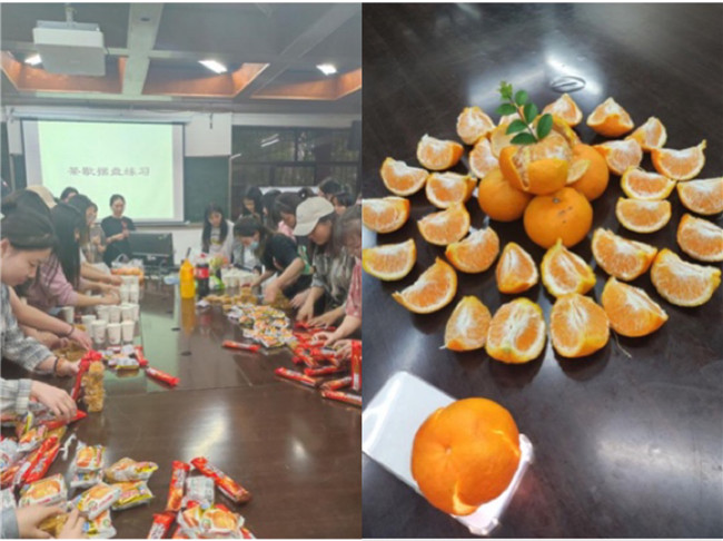 本网讯(图、文/汪舟)5月23日、24日晚,在《会展策划与管理》任课教师汪舟的指导下,2019级旅游管理3、4、5班同学分别在行知楼213教室、旅院楼102教室开展了以茶歇摆盘为主题的实践操作。活动开始前,汪舟老师精心准备了摆盘食材及零食、糕点,并现场介绍和展示了常见的茶歇摆盘形式,要求同学们以班级为单位按照课程要求,积极发挥主观能动性和创造性,进行茶歇摆盘。