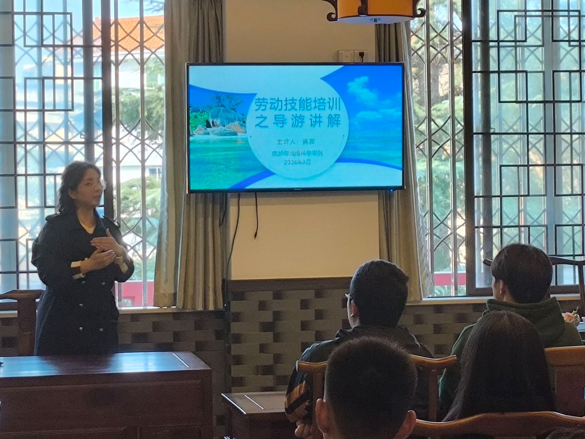 首先,吴薇就导游词讲解作大概地阐释,让同学们有了更深入的了解。随后,吴薇从导游词的结构、文字和个人形象气质的匹配等角度对导游词写作进行指导。吴薇强调讲解的表达要有交流感,要求同学们对稿子有一定的熟练度,讲解时的语言要逻辑清晰,语气顺畅。同时,吴薇还提到讲解技巧与声音和气口的训练方法,并邀请部分同学对各个模块进行尝试与指导改善。