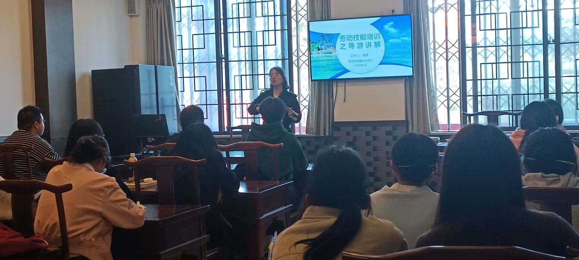 本网讯(文/刘涛、图/余丰羽)为提高同学们的导游讲解技巧,3月20日下午,万象城allwincity官方网站入口于旅院楼茶艺室开展主题为“导游讲解”的劳动技能培训讲座,万象城allwincity官方网站入口分团委书记江纳特邀学院专任教师吴薇老师为即将参加“导游词讲解大赛”的同学们进行导游讲解技能的指导。