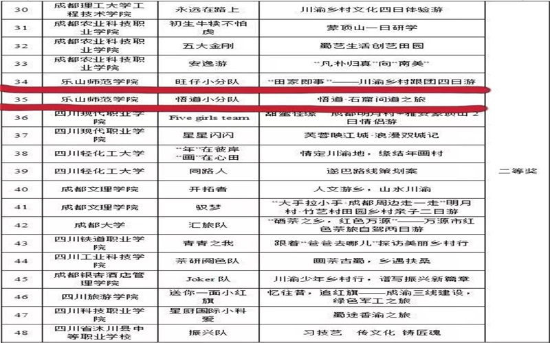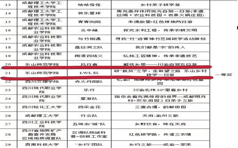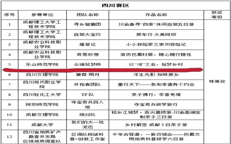 大赛组委会按照四川、重庆、其他省份三个赛区进行评审。经专家评审,最终旅游学院共有五个团队获奖。其中由但强和左莉老师共同指导的作品《以“河”之名,拾梦乡村》斩获了四川赛区特等奖;由汪舟老师指导的作品《研“脱贫”之学,走希望之路 乐山乡村研学一日游》荣获四川赛区一等奖;由陈金龙和郭剑英老师共同指导的作品《解忧乡思——川渝自驾五日游》荣获四川赛区一等奖、 《“田家即事”——川渝乡村跟团四日游》以及《悟道.石窟问道之旅》荣获二等奖。