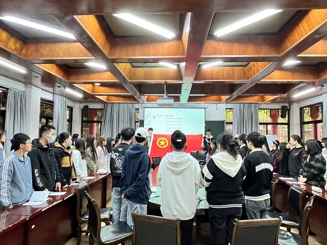 培训以迎团旗、唱团歌为序幕。第一位宣讲团成员刘雨玫向学员们宣讲了中国共产党第二十次全国代表大会精神,她从高举中国特色社会主义伟大旗帜、全面贯彻新时代中国特色社会主义思想、全面建设社会主义现代化国家等方面讲解了党的二十大会议内容。第二位宣讲团成员文雯以沐川县为例讲解了增进民生福祉,提高人民生活品质的成就与方法,深化了“奋进守民心,领航新征程”的主题。宣讲团成员曹恋讲述了优秀中共党员黄文秀的生平以及她为脱贫攻坚所作出的贡献。学员们纷纷就学习心得作了分享。