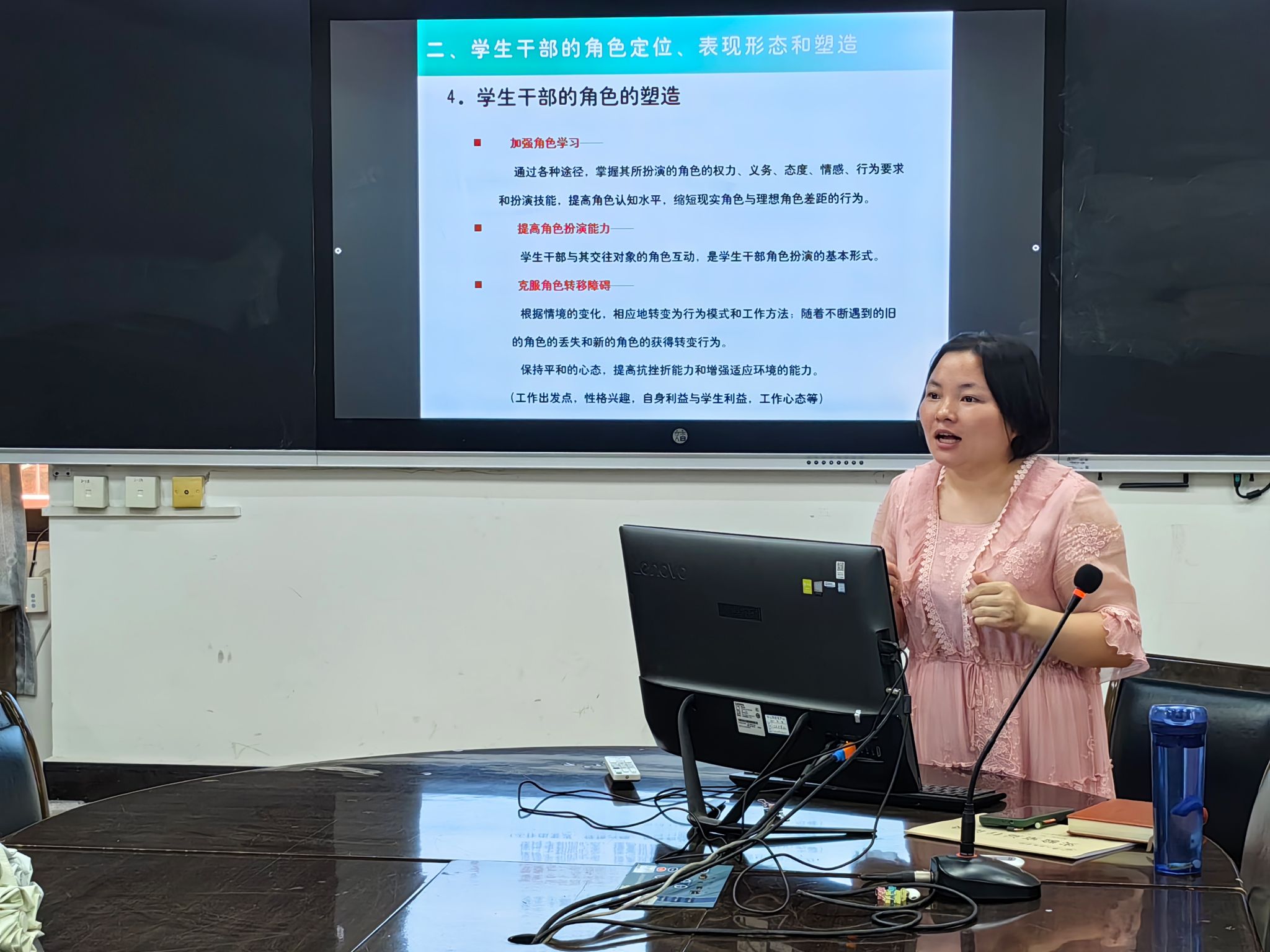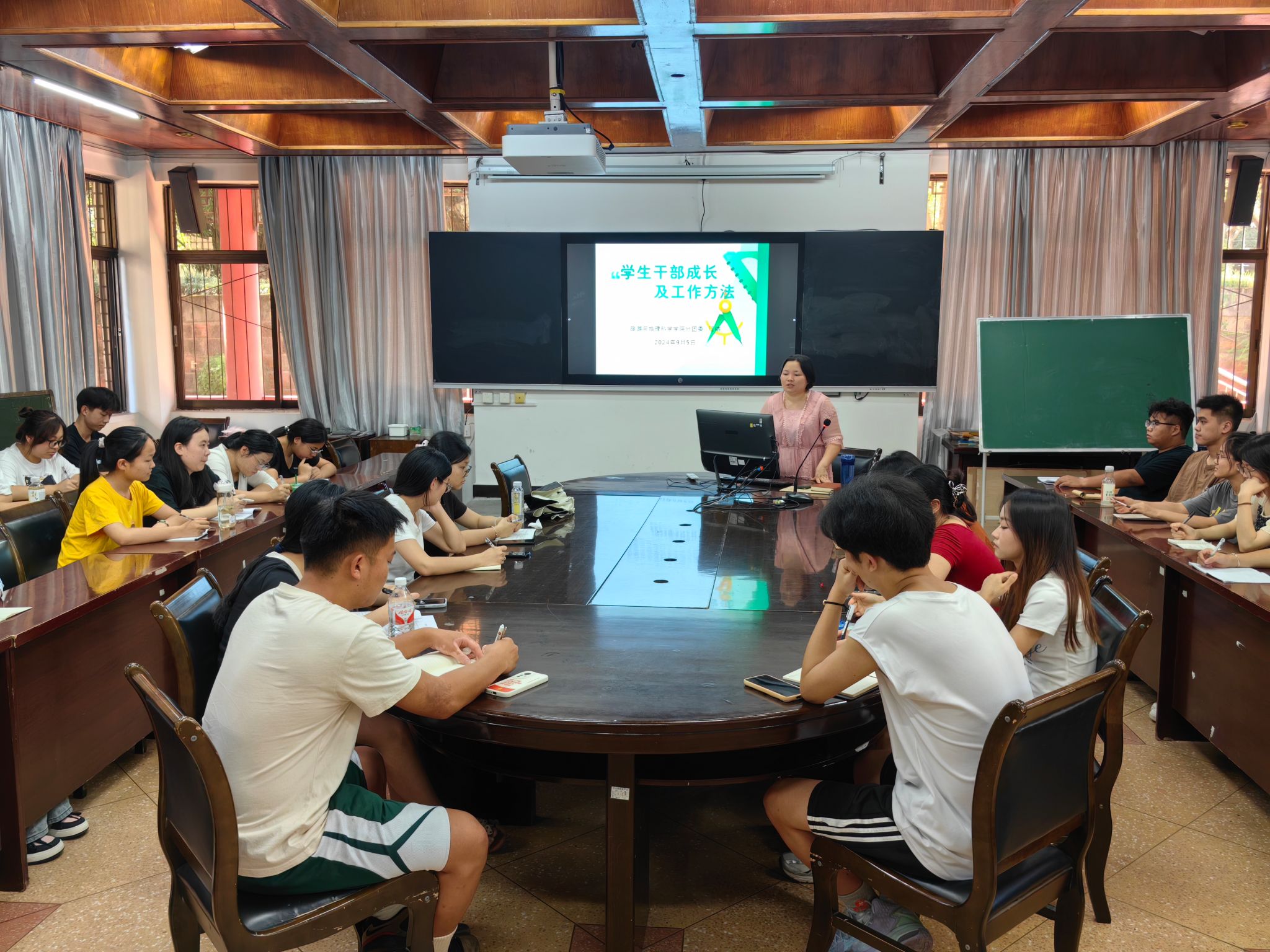 培训会上,江纳首先强调了学生干部在学校文化建设和学生自我管理中的重要作用。她指出,学生干部是连接老师与学生的桥梁,是推动校园文化建设的重要力量。因此,提高学生干部的综合素质,对于营造积极向上的校风学风至关重要。她为学生讲解了学生干部的角色定位、学生干部的素质和能力要求、领导力培养、时间管理、团队建设等内容。