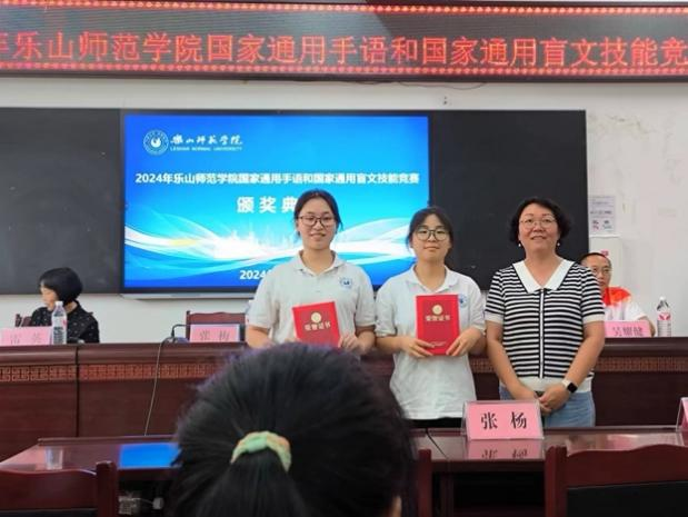 本网讯(文/黄雪影、陈越,图/袁静婷)在9月12日下午刚刚结束的2024年乐山师范学院国家通用手语和国家通用盲文技能竞赛中,来自万象城allwincity官方网站入口的袁静婷、胡益萍老师带领的黄雪影和陈越团队荣获非专业组团体第一名。这场以“心手舞青春,指尖读世界,同筑中国梦”为主题的竞赛,旨在深入贯彻落实《国家通用语言文字法》精神,推广国家通用手语和盲文,提升大学生的专业技能和社会融合能力。