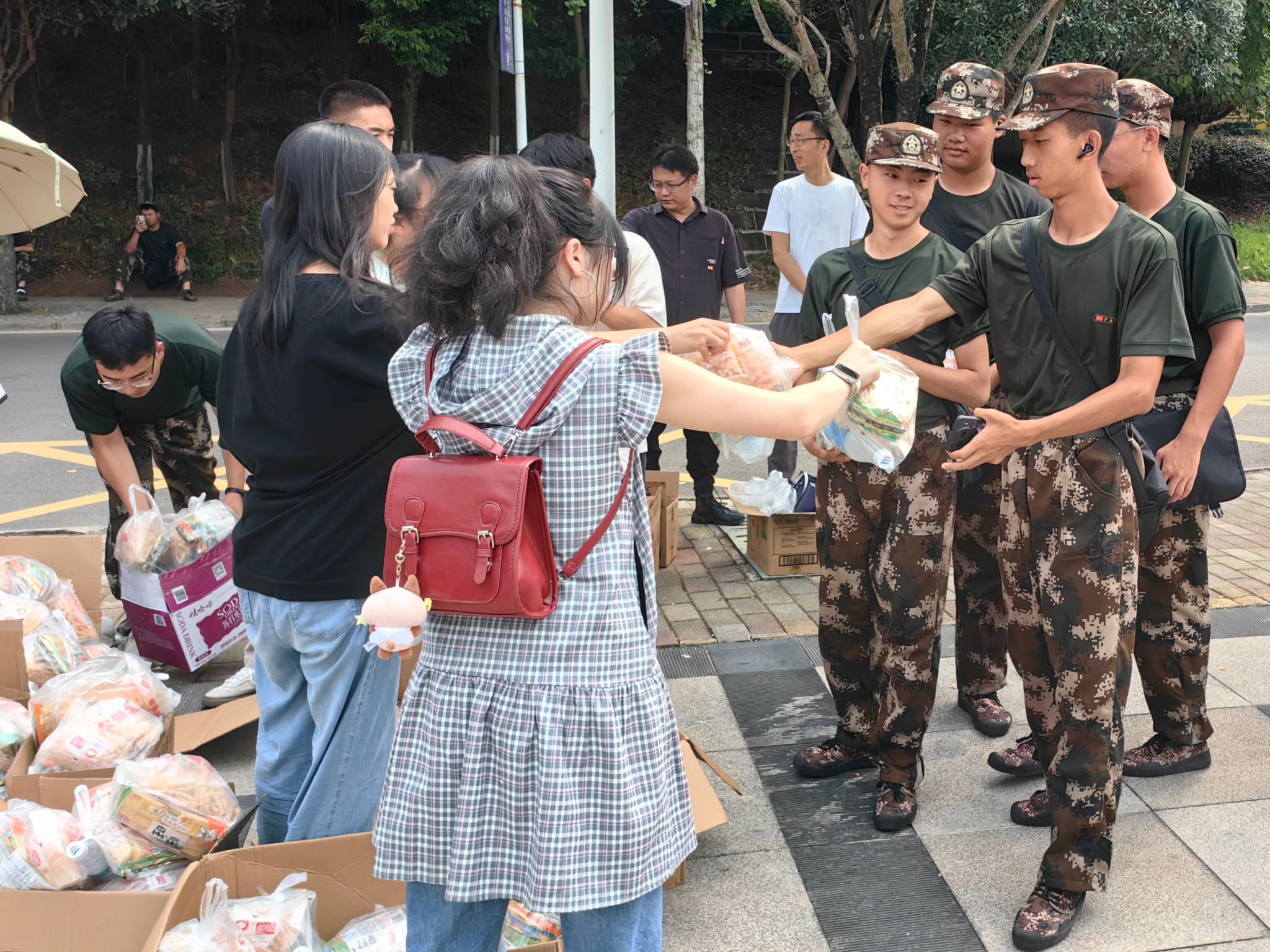 最后,学院领导、老师和代班向教官和全体新生发放了慰问品。