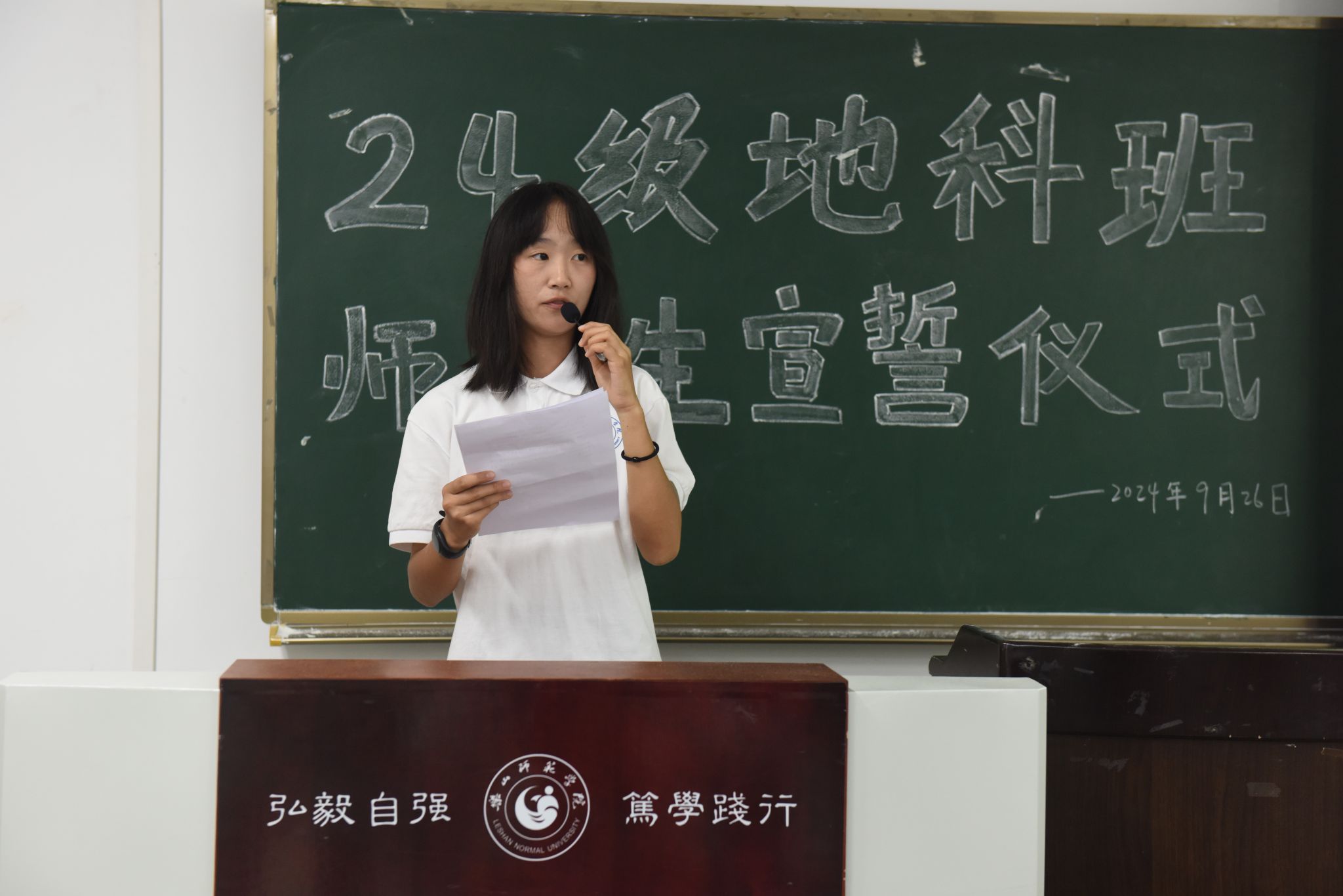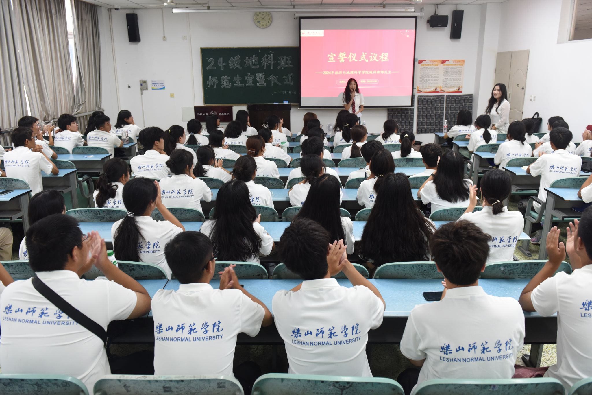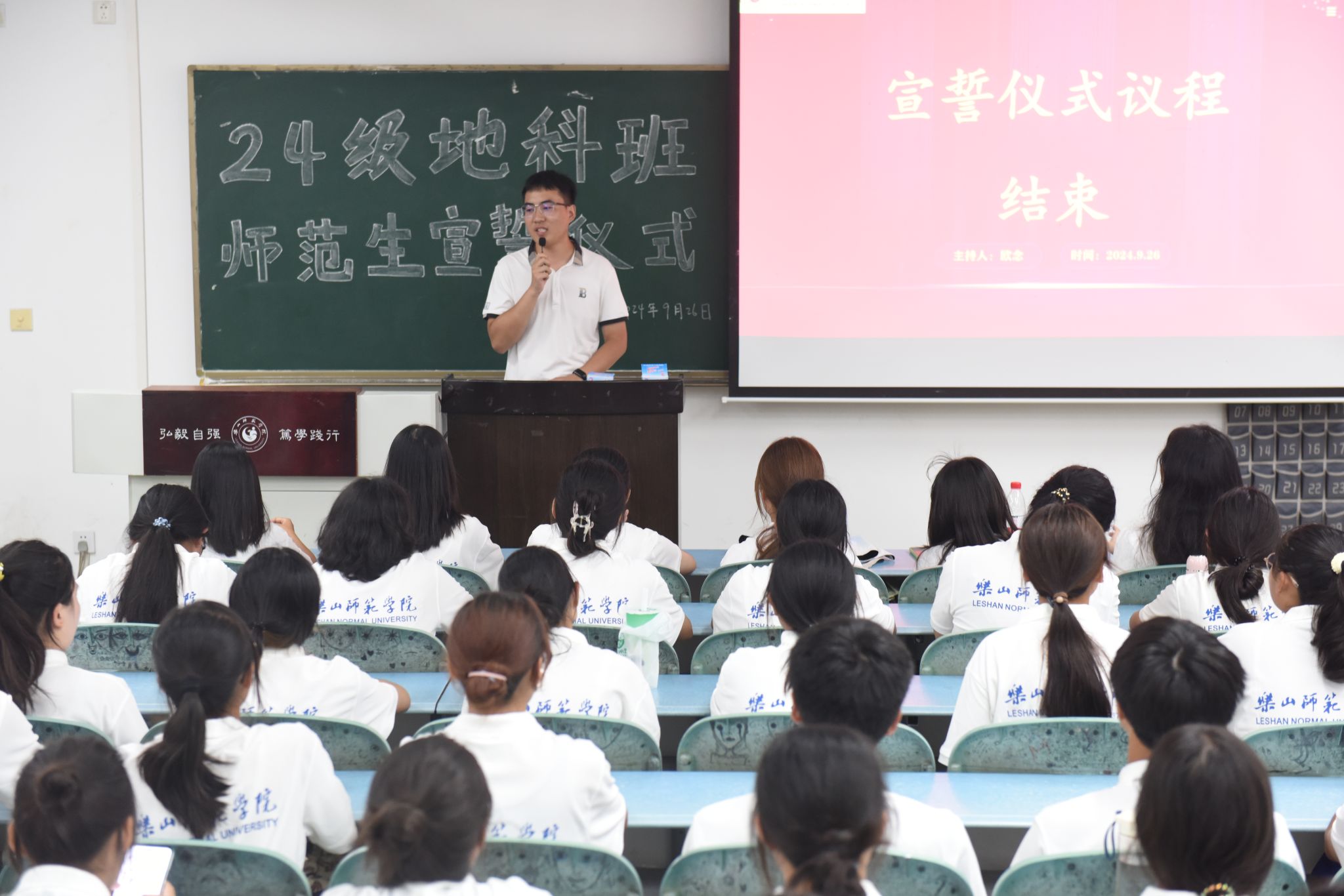 本网讯(文、图/刘涛)9月26日下午,万象城allwincity官方网站入口在行知楼213教室举行“师范生宣誓”活动,24级辅导员王强、班主任向婉丽及24级全体地科班的同学参加了本次活动。