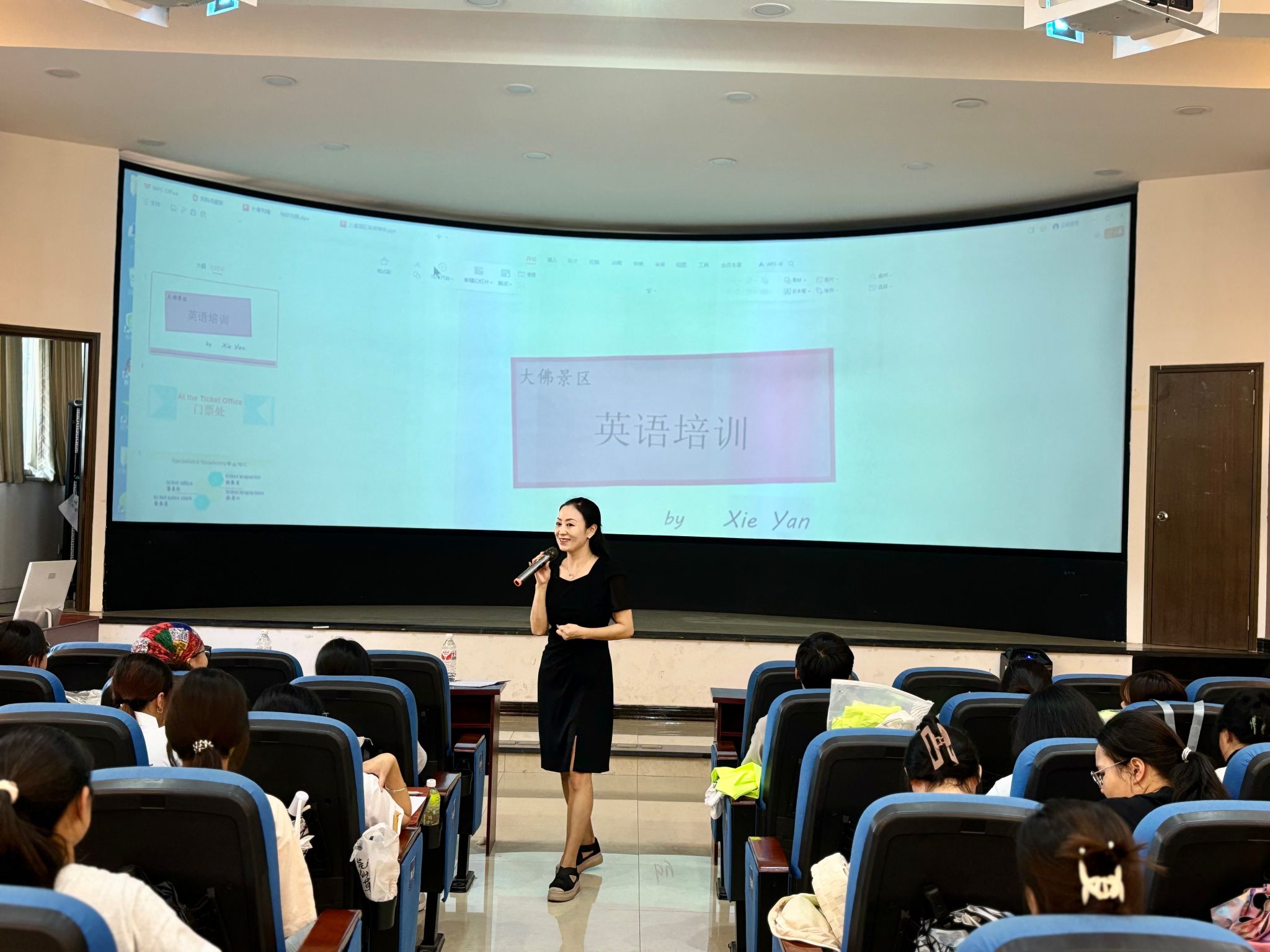 谢艳从理论与实践两个部分,为学生讲解了旅游英语的知识点,通过互动式教学培养和锻炼同学们的口语交际技能。她在培训中拓展了中西方文化差异与社交礼仪注意事项,强调在当今世界全球化日趋明显的今天,旅游从业者要有国际视野,为游客提供热情服务并尊重所有游客。