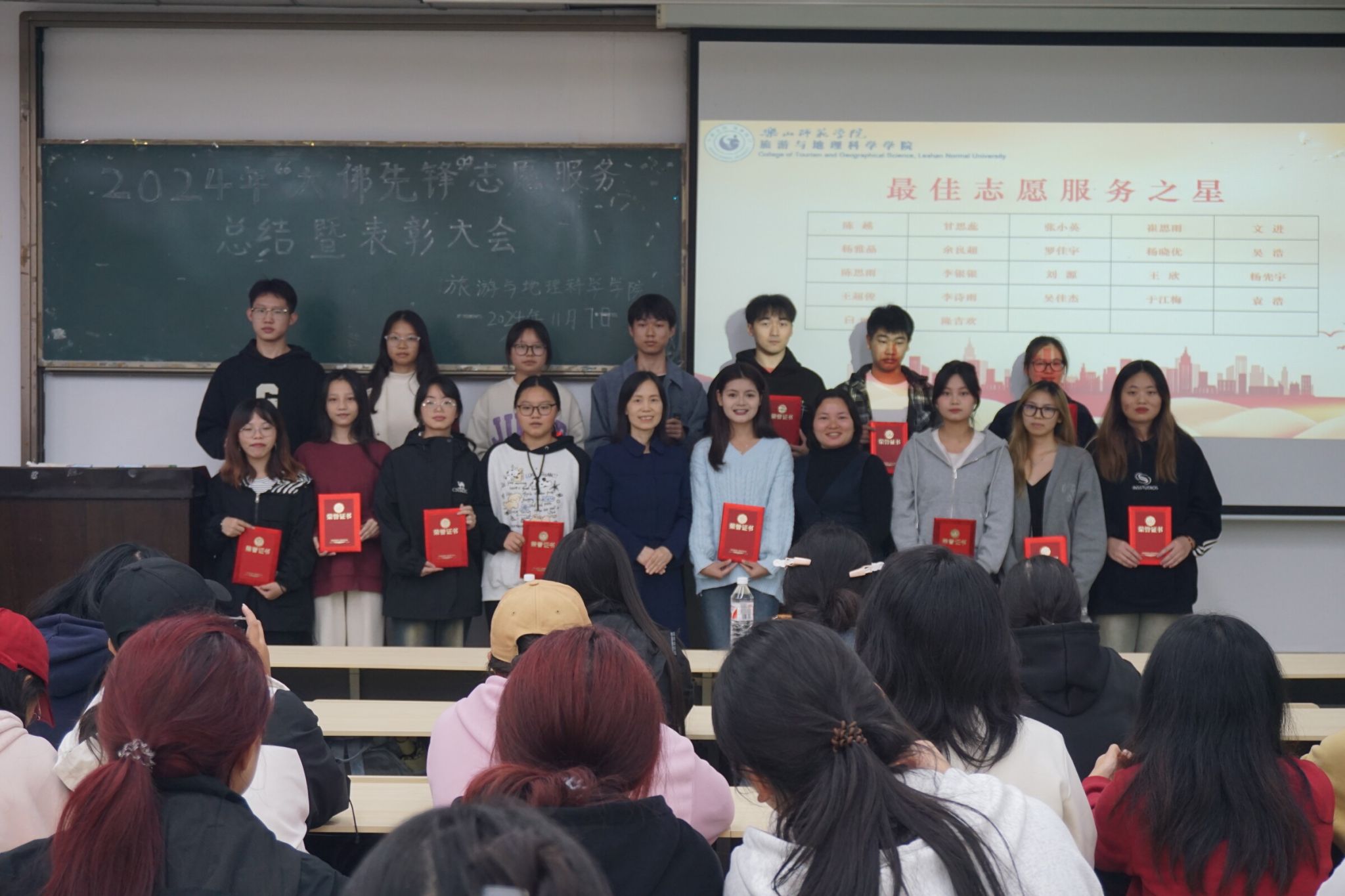 在热烈的掌声中,2024年“大佛先锋”志愿服务总结暨表彰大会拉开了序幕。三位优秀景区服务志愿者分别分享了在七天的志愿服务工作中的收获和成长。徐秀云和江纳为吴佳杰、张澜、隆吉欢等获得“最美志愿服务之星”“最佳宣传视频奖”“优秀摄影作品奖”“最佳实践报告奖”“最佳志愿服务团队奖”称号或奖项的同学们颁发了奖状并合影留念。