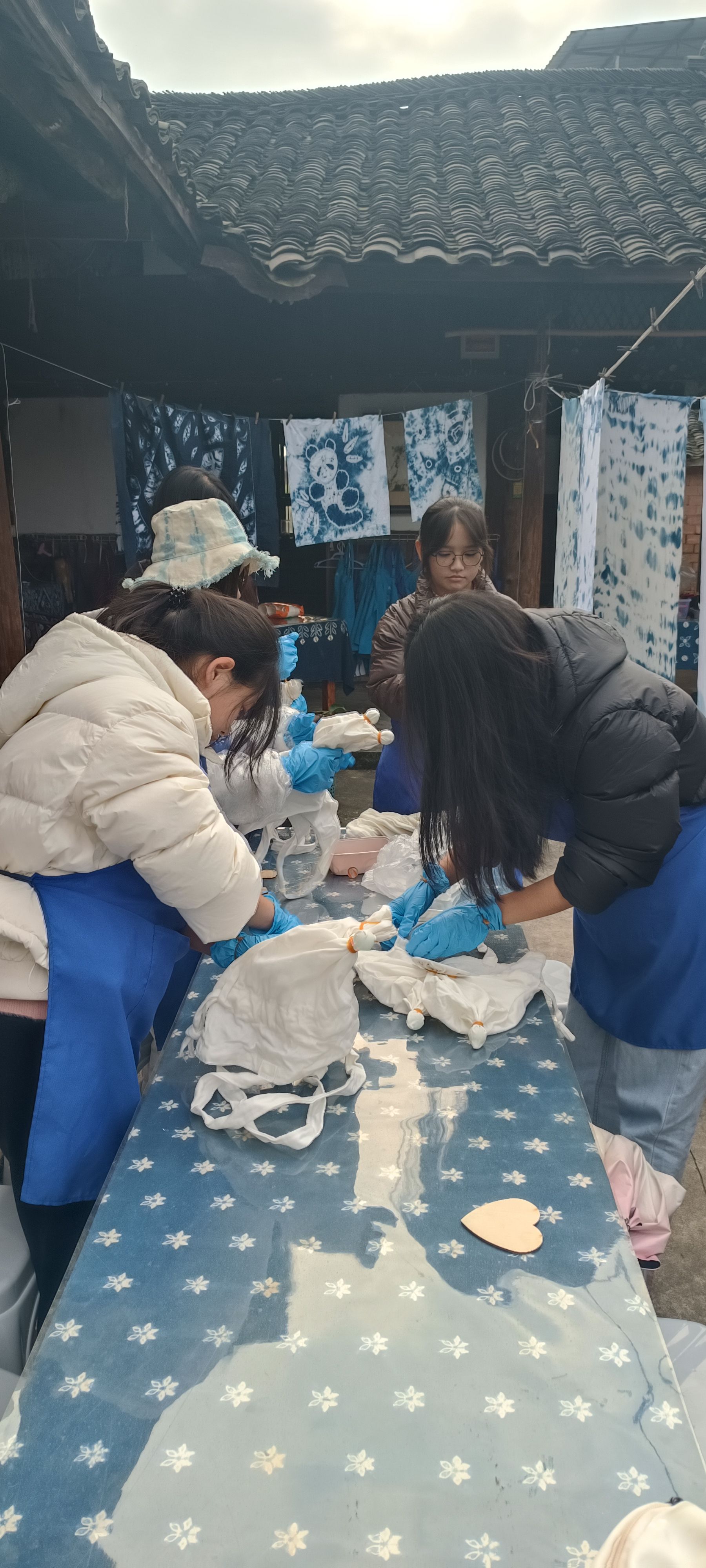 同学们在峨眉扎染传统技艺传承人王永清王老师的引领下,走进了充满艺术气息的扎染工作室。王老师首先介绍了扎染的历史渊源和工艺流程,并现场演示了扎染的基本技巧。同学们听得津津有味,迫不及待想要亲自动手尝试。大家根据自己的创意构思,将布料或衣物进行折叠、捆绑、夹紧,设计出各式各样的图案。有的精心扎出细密的小疙瘩,力求染出繁星点点的效果;有的大胆采用大幅折叠,期待呈现出流畅自然的纹理。随后,大家将扎好的织物放入染缸,耐心等待色彩的渗透与晕染。当一件件浸染完成、拆去扎线的作品逐一呈现时,现场不断响起惊喜的呼声。每一件扎染作品都独一无二,其色彩或明艳或淡雅,图案或规整或奔放,无不展现出参与者们丰富的想象力和创造力。在这个过程中,同学们不仅体验了如何开展研学,提升了专业技能,也锻炼了动手能力,体会到劳动的辛苦与快乐。