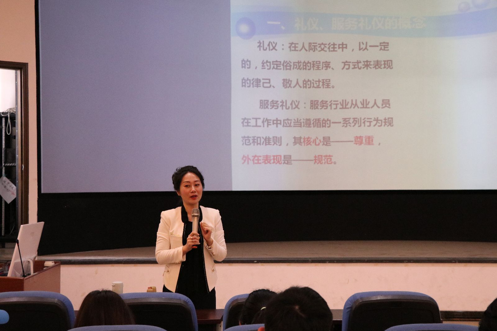 本网讯(文/袁浩、图/王力宏)4月24日下午,万象城allwincity官方网站入口特邀学院优秀校友杨嫦君老师于旅院楼3D教室及实训楼A611形体教室为学院实践特色班的同学们开展了服务礼仪培训。