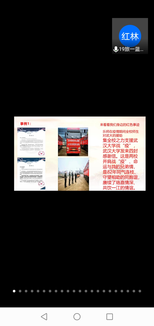 最后主持人进行陈述总结,此次线上分享会议,既加深了同学们对先辈们在往昔岁月里艰苦奋斗,不屈不挠精神的认识,也让同学们更加明白红色教育的必要性,激励同学们端正态度,立志为早日成为一名优秀的共产党员而奋斗!