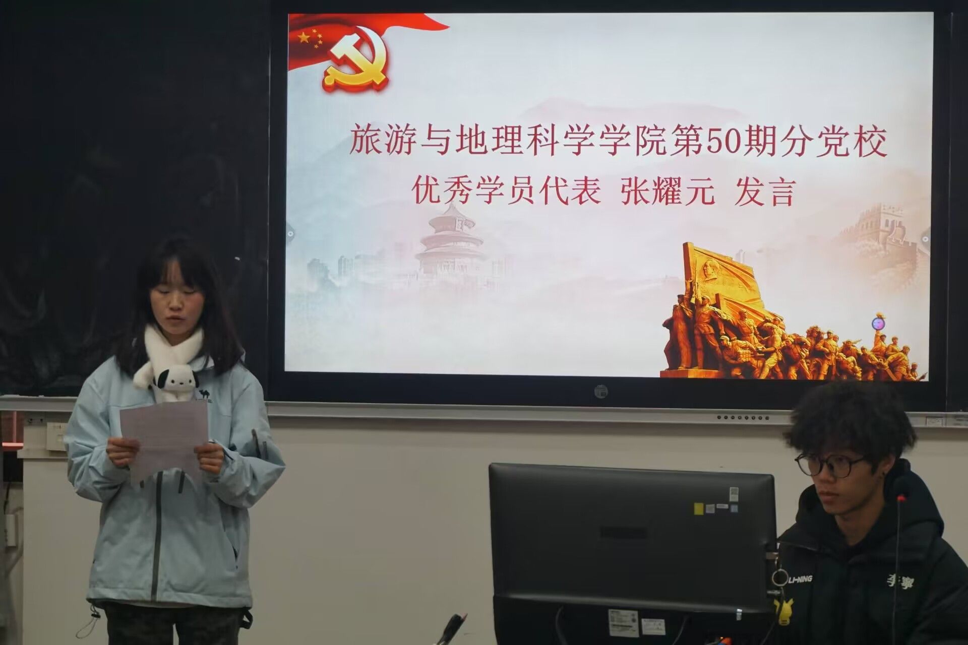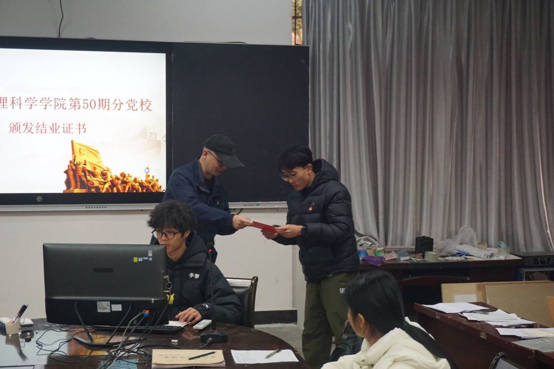 结业典礼在庄严的《国歌》声中拉开了帷幕。第50期分党校优秀学员代表张耀元作了发言,她说,本次党校学习使她提高了思想觉悟,认识到了自身的优缺点,增强了对党的理论的学习和领悟。在阅读分享环节,陈婉欣和杨添程分享了红色经典书籍。孟凡帅为学员颁发了结业证书,对本次党校培训作了总结,对大家的努力予以了肯定,也对入党积极分子相关材料提出了明确要求。