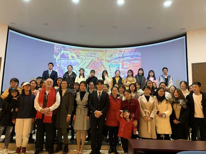 本网讯(图/文尹国欣)12月19日晚上,12月19日19点30分左右在旅游学院3D实验室举办了由学生分会学科部组织的英语角和小语种的创新成果展示,张科德先生、Nookie老师、学生科长左莉老师、18级辅导员郑曾俊老师和19级辅导员谭妙老师以及部分参加英语角和小语种的同学参加此次成果展。