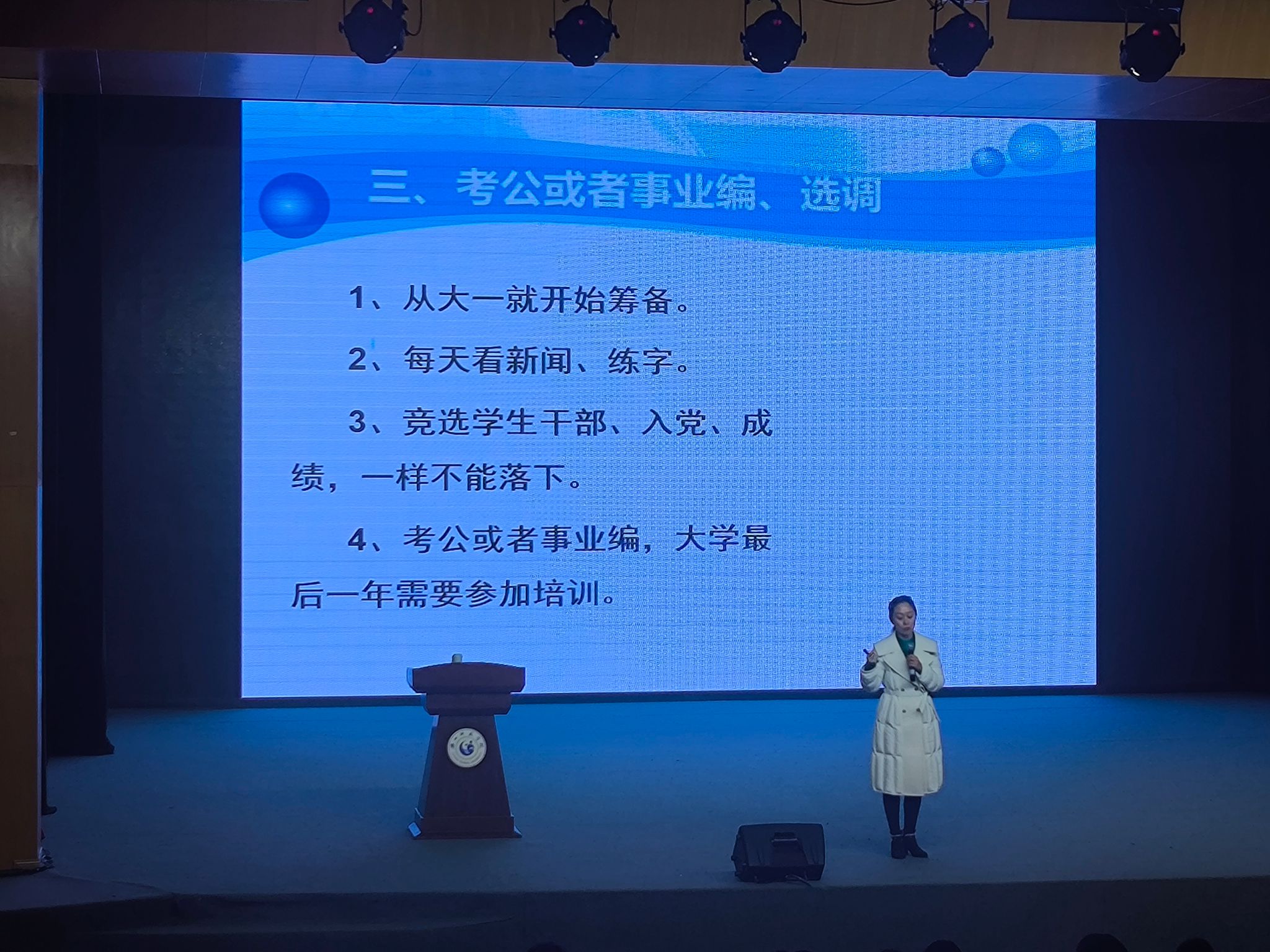 杨嫦君从大学生毕业后的方向开始讲解,详细介绍了考研、士兵计划、事业编考试等。她结合自己的亲身经历和体会,建议同学们要分析清楚自己的潜能,正确认识自己的长处,结合个人实际情况确定适合自己的职业方向,并努力提升自己的专业技能和素养,在实践中探索出适合自己的道路,通过自己的奋斗和拼搏去实现自己的梦想。杨嫦君针对大学生的职业选择,强调大学生要注重匹配社会需求,提高自身素质和能力,做好职业生涯规划,为未来就业做好准备。