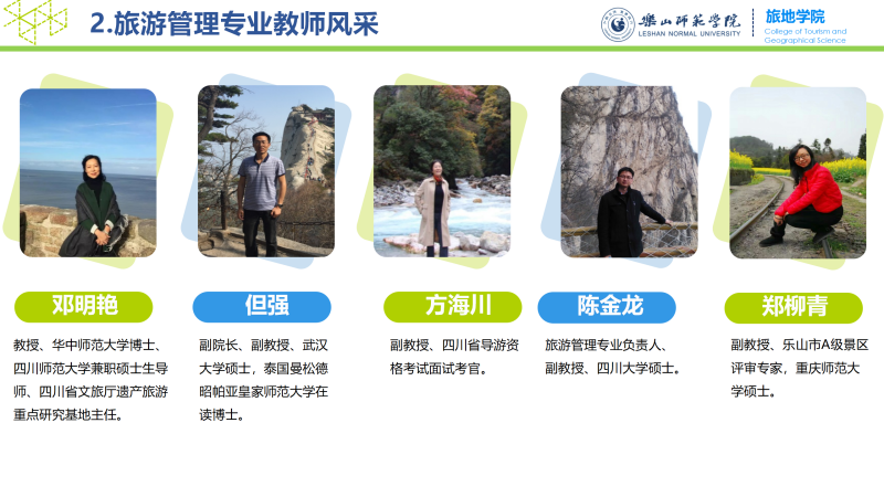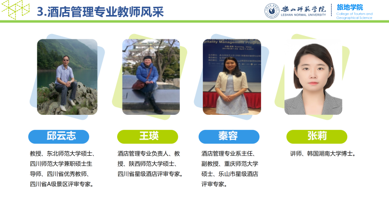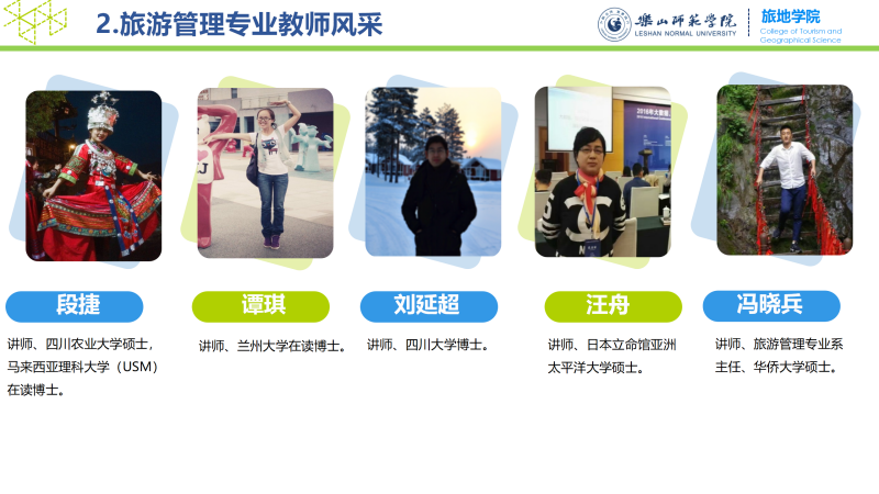 万象城allwincity官方网站入口是学校重点建设的特色学院,是教育部和四川省“本科教学工程”地方高校第一批本科专业综合改革试点单位、国家西部旅游专门人才培训示范单位、教育部大学生综合类校外实践教育基地建设单位、支持四川省“十一•五”旅游业发展先进单位、中国旅游协会旅游教育分会先进单位,在全国具有较强影响和较高的知名度。开设有旅游管理、酒店管理、人文地理与城乡规划、地理科学(师范)、旅游管理和酒店管理职高对口等本科专业。现有教职工43人,其中教授7名,副教授10名,博士14名,外籍专家1人、教育部专家1人,四川省优秀教师1人,四川省学术和技术带头人后备人选1人、硕士生导师7人。