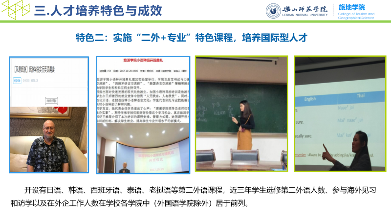 学院现有学生近1400人,注重学生的个性化发展和职业技能培养,积极探索校企合作模式、“小语种+”模式、创新创业人才培养模式。近三年,学生在“挑战杯”、全国饭店服务技能、导游服务技能、旅游创新策划等大赛中获国家级、省级奖励100余人次。就业率和高质量就业率连续三年名列学校前茅,毕业生受到用人单位的一致好评。