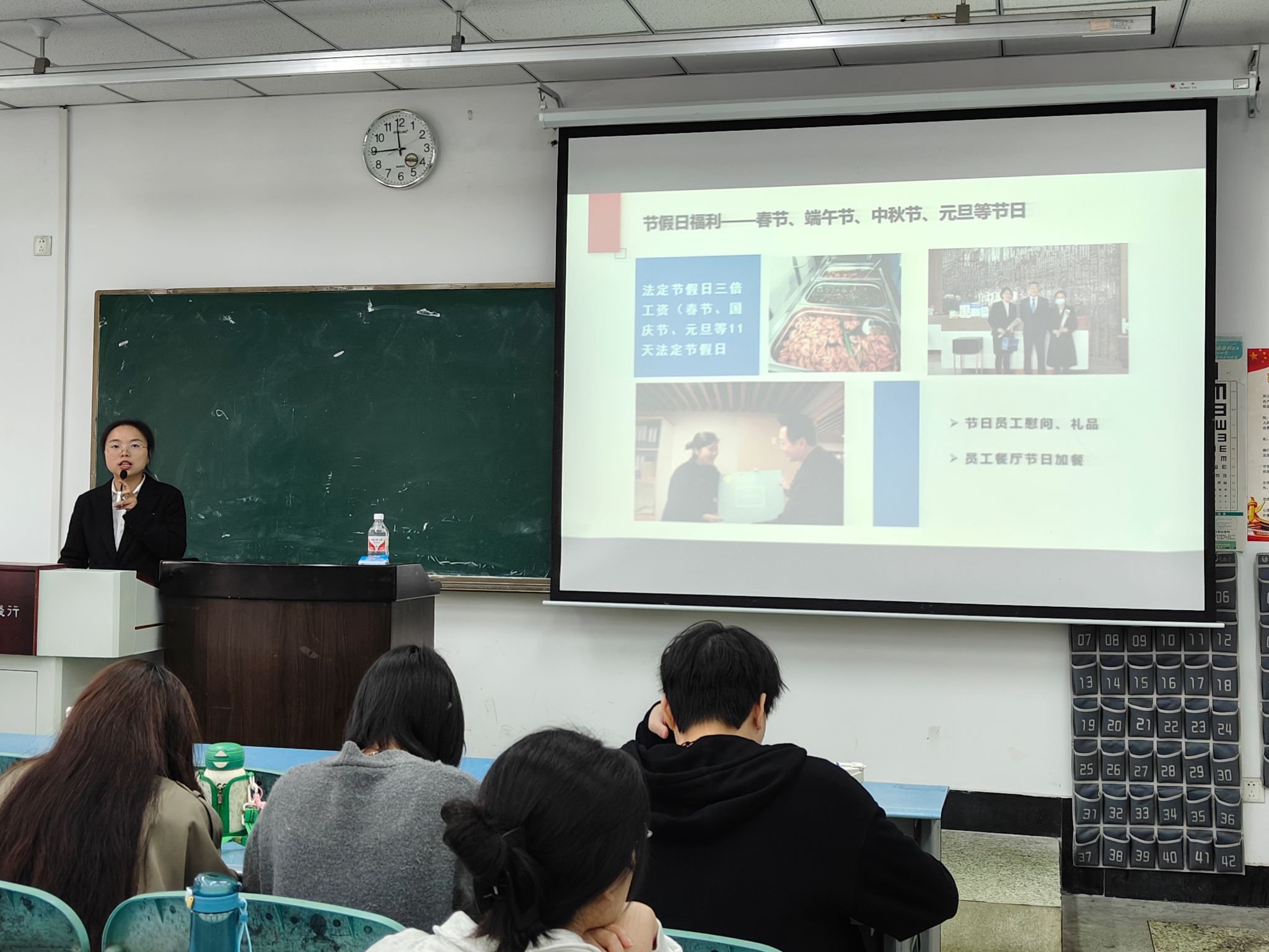 本网讯(文、图/陈佳炫)4月7日,万象城allwincity官方网站入口在行知楼213教室举办了“酒店管理职业发展路径”主题讲座。乐山高新翰文大酒店总经理张威携管理团队莅临指导,为学院2022级酒店管理专业学生带来一场理论与实践深度融合的职业规划讲座。