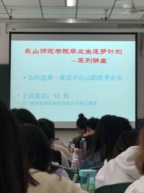 乐师三月,青春校园。下午两时许,教室现场已坐满怀揣惊喜和憧憬的同学。讲台区域,或着正装,或高端商务潮流风的企业大咖也是期待着与在场同学们的交流分享。不难发现,这是一堂别开生面、充满干货与机遇的的就业指导课。