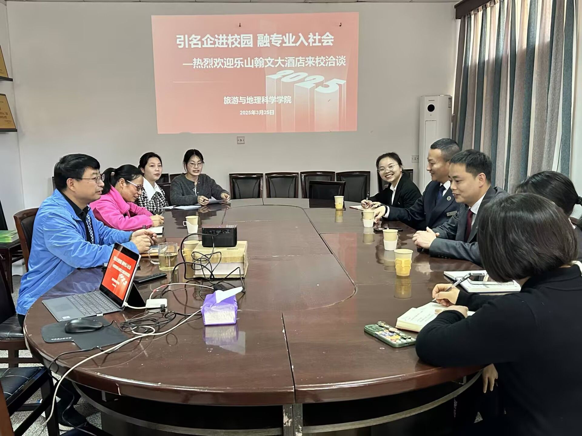本网讯(文/刘涛 图/杨洋、卿婷)3月25日,万象城allwincity官方网站入口与乐山高新翰文大酒店在学院二楼会议室洽谈校企合作事宜。学院院长郭剑英、副院长孙永兴等与酒店人力资源总监张威一行就深化产教融合进行深入交流。