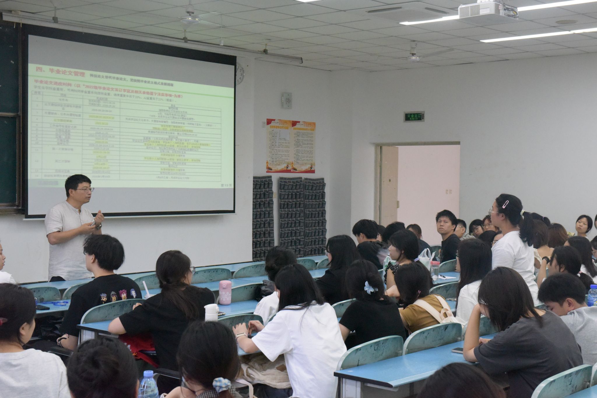 孙永兴详细讲解了学校和学院关于实习安排及毕业论文的政策要求,全面介绍了各专业的实习特点、实习基地资源配置情况,以及实习与考研时间的协调方案。他强调,同学们应合理安排时间,妥善处理实习与考研的关系,并希望大家在独立自主的基础上,保质保量地按时完成论文撰写,做好答辩准备。在互动问答环节中,同学们围绕实习单位选择、职业发展路径、就业前景等问题踊跃提问。孙永兴结合行业动态与学生实际情况,逐一进行了解答和指导。