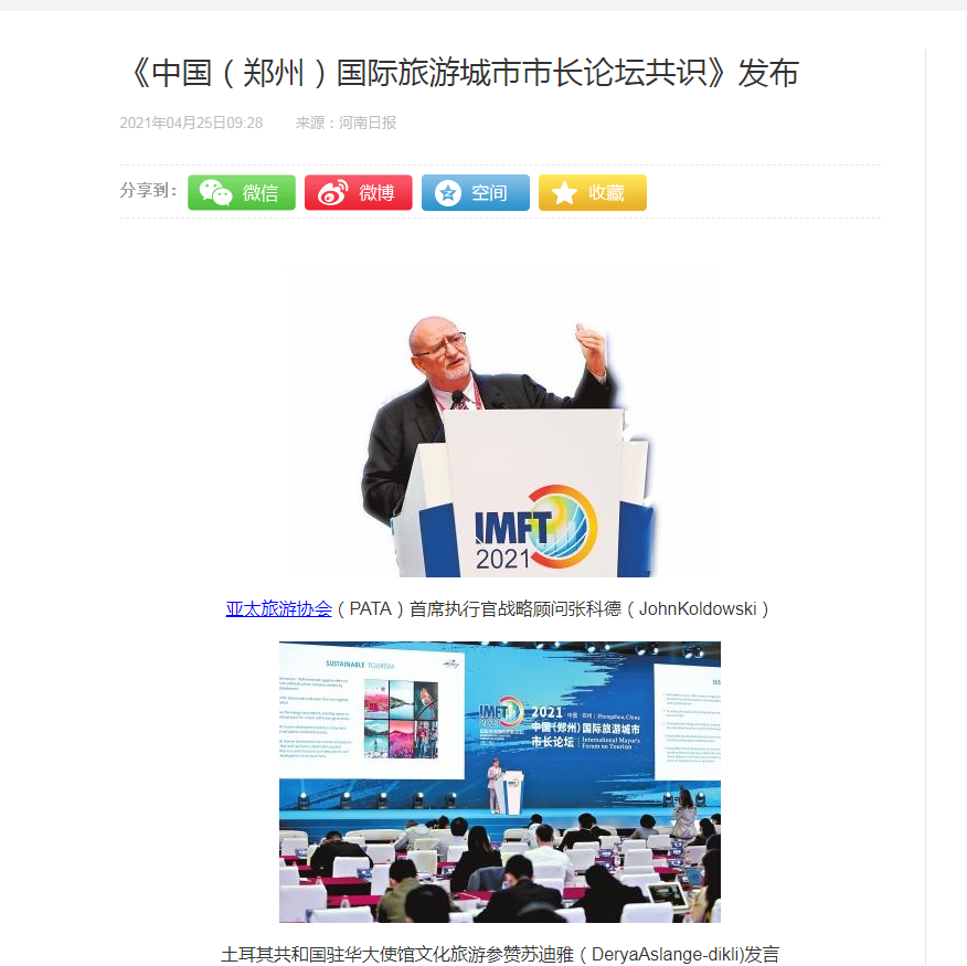 本网讯(文图/王一鸣)4月21日,2021中国(郑州)国际旅游城市市长论坛在郑州国际会展中心开幕,河南省省委书记王国生、文化和旅游部副部长张旭、联合国世界旅游组织执行主任祝善忠、世界旅游联盟主席段强、塞拉利昂驻华大使欧内斯特·恩多马希纳、斯里兰卡驻华大使帕利塔·科霍纳,河南省和郑州市主要负责同志,以及来自海内外的众多旅游城市的市长、代表和世界五大旅游组织在内的458名嘉宾荟萃一堂,通过线上与线下相结合,共同探讨后疫情时代旅游业发展方向、合作路径和模式创新,共同展望全球旅游业发展的未来。本届论坛由文化和旅游部、河南省人民政府主办,河南省文旅厅等承办,联合国世界旅游组织、联合国工业发展组织投资和技术促进办公室、世界旅游联盟、亚太旅游协会、中国旅游研究院作为论坛全程支持单位,携程集团为论坛协办方,以“市场繁荣、科技创新提升城市旅游竞争力”为主题。旅游学院外籍专家张科德应邀参加了本次论坛。