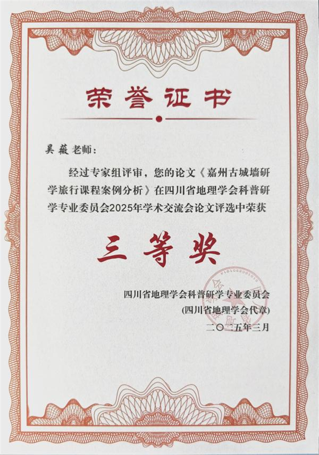 王艺熹的论文《无人机科普研学活动设计与实践》与吴薇的论文《嘉州古城墙研学旅行课程案例分析》荣获大会论文三等奖。两篇论文分别围绕无人机技术在地理科普教育中的创新应用和嘉州古城墙历史文化资源的课程开发实践,展现了旅游与地理科学院在地理科普研学领域的前沿探索和教学创新能力。