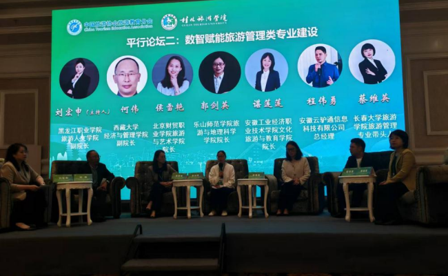 理事会议后,还召开了中国旅游教育论坛,包含4个主旨演讲和6个平行分论坛。郭剑英参加了平行论坛二《数智赋能旅游管理类专业建设》圆桌讨论,就数智赋能师资建设、现代产业学院建设等方面分享我校经验做法。