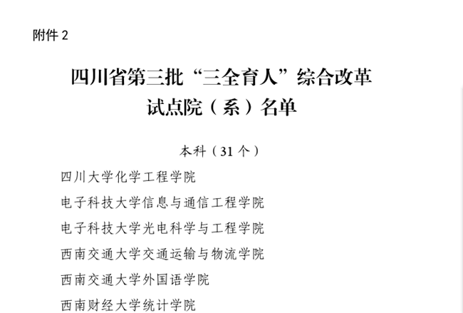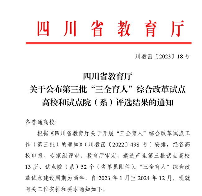 本网讯(图、文/薛文娟)近日,四川省教育厅公布了第三批“三全育人”综合改革试点高校和试点院(系)评选结果。万象城官网成功入选综合改革试点院(系)。