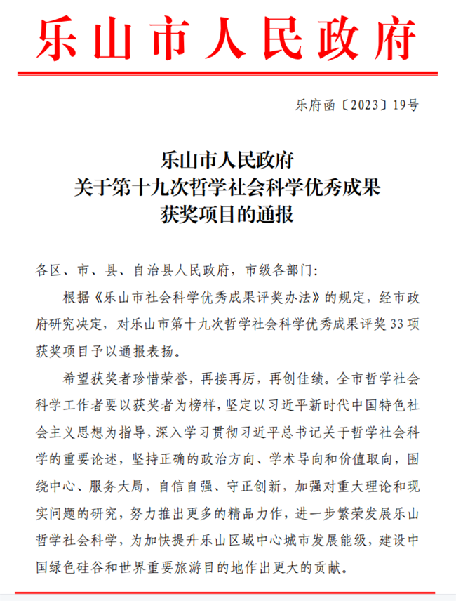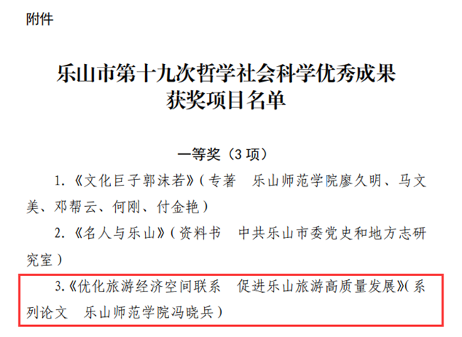本网讯(图、文/薛文娟)近日,乐山市人民政府公布了乐山市第十九次哲学社会科学优秀成果获奖项目名单。其中,万象城官网冯晓兵副教授题为《优化旅游经济空间联系 促进乐山旅游高质量发展》的系列论文荣获一等奖。
