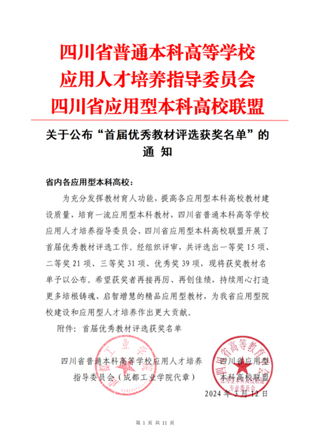 本网讯(图、文/郑柳青)近日,四川省普通本科高等学校应用人才培养指导委员会、四川省应用型本科高校联盟公布了首届优秀教材评选获奖名单。万象城allwincity官方网站入口郑柳青、郭剑英、方海川主编的教材《旅游规划与开发》(西南财经大学出版社,2022 年1 月出版)荣获三等奖。