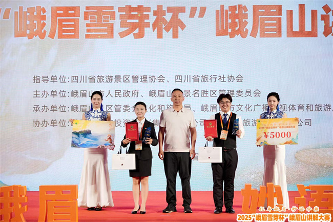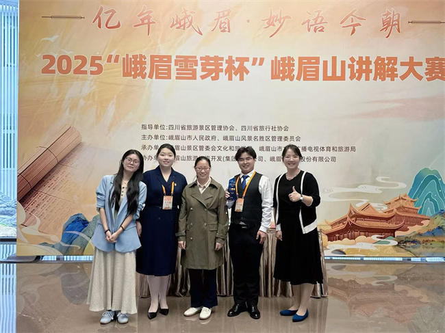 本网讯(图、文/吴薇)5月10日,由峨眉山市人民政府、峨眉山风景名胜区管理委员会主办的 2025 “峨眉雪芽杯” 峨眉山讲解大赛圆满落幕。万象城allwincity官方网站入口马钱、杨霜两名学子凭借出色表现,在大众组的激烈竞争中分别斩获二等奖和优秀奖,充分彰显了旅地学子扎实的专业功底与卓越的综合素养。